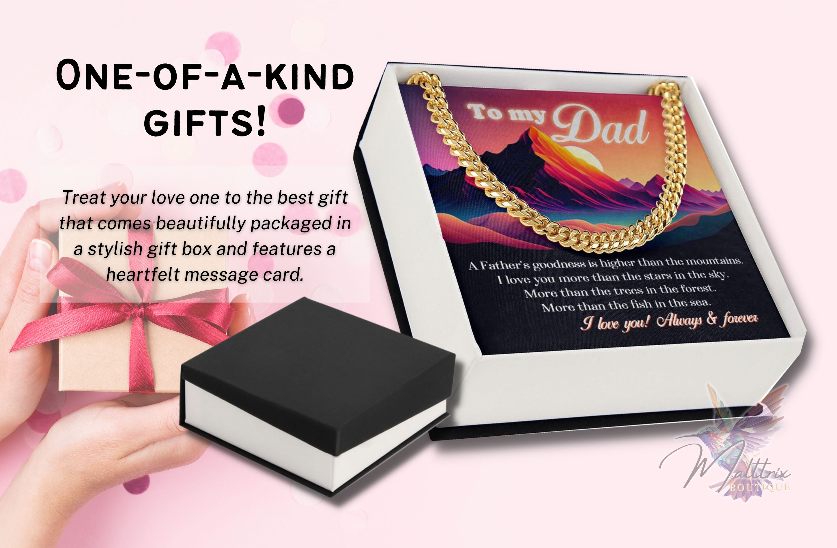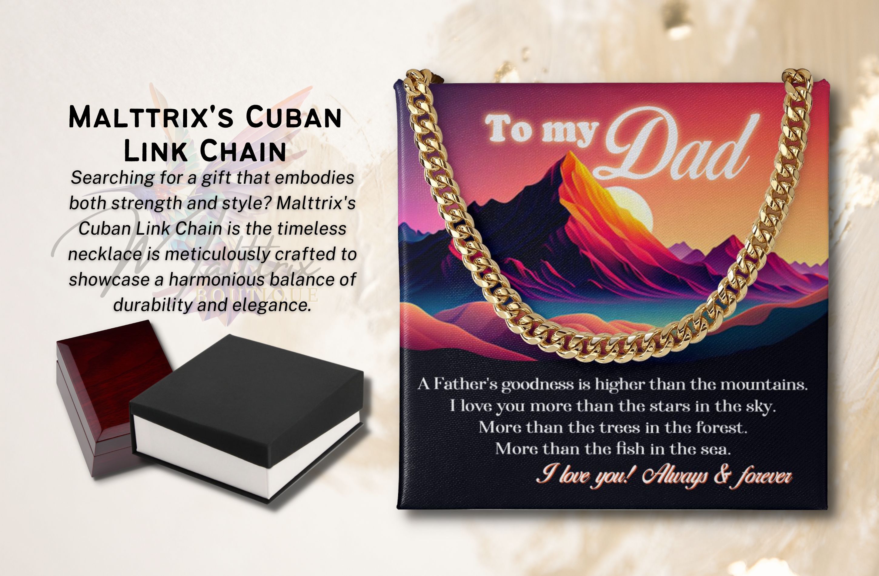 Give the gift of timeless elegance with our Malttrix’s Cuban Link Chain. Whether it’s for yourself or a loved one, this necklace is a true symbol of strength and style that will be treasured for years to come.
